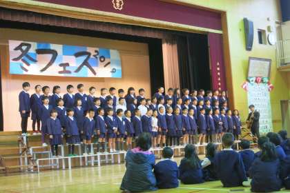 なんとサプライズで1年生が「12月だもん」2年生が「ビリーブ」を披露してくれました。元気いっぱいな歌声が講堂いっぱいに広がりました。