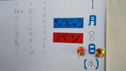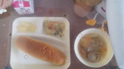 今日から給食が始まりました。グラタンにだいこんスープに和なしの缶詰です。