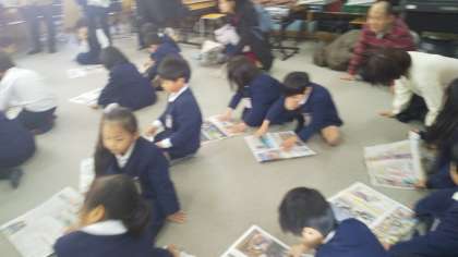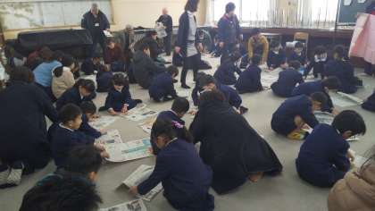 1年生はお家の人と一緒に防災スリッパを新聞紙で作りました。実際起こったとき に、割れたガラスなどの上を歩くのに役立ちます。そのあと、防災カルタをしました。 地域の方や区役所の方も一緒に学習しました。