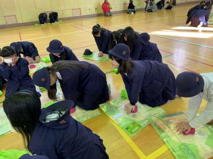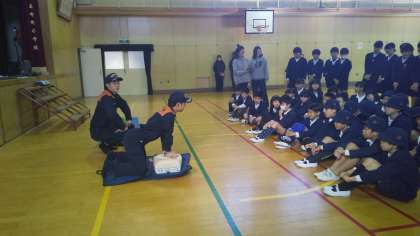 6年生は、講堂で、消防署の方に来ていただいて心肺蘇生法とAEDの使い方について学習しました。あっぱくんという学習用具を使って、数を数えながらしました。