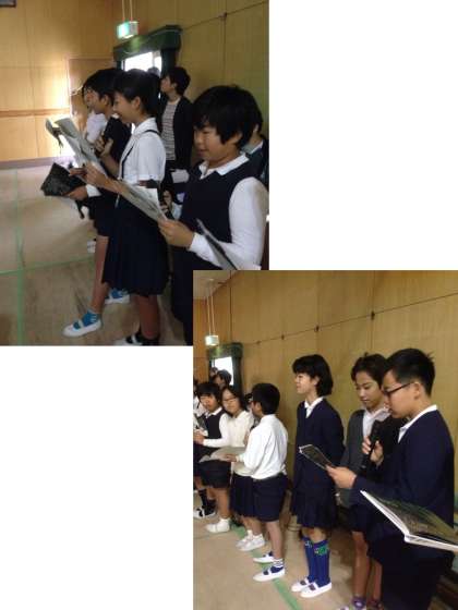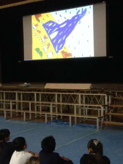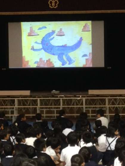 今日の児童集会は、図書委員会の発表でした。恐竜さんが出てくる絵本「いちばんあいされてるのはぼく」のさし絵を自分たちでかき、先生にパソコンの中に取り込んでもらいます。講堂の大きなスクリーンに映る大きな紙芝居のできあがりです。スクリーンの絵、BGM、そして、図書委員会のみんなの朗読がバッチリ合っていて、とても楽しかったです。「読書の秋」にぴったりの内容でしたね。