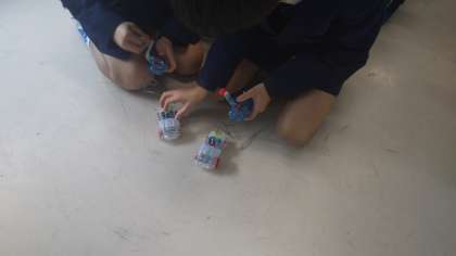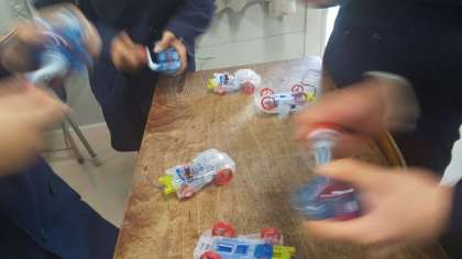 手回し発電で車を走らせました。みんな夢中で発電していました。