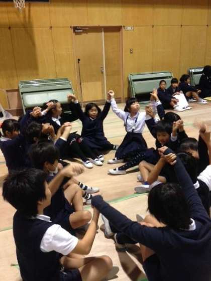中野小学校の児童集会の発表でクイズが出題されたときは、写真にあるように、縦割り班1〜6年生で相談し合って答えを考えることが多いです。いい雰囲気ですね。