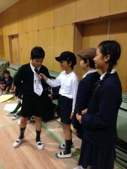 新聞記者に扮した新聞委員会の児童たちが、ミニ劇を演じながら新聞委員会の活動を発信しました。途中、クイズや校長先生へのインタビューがあったりで、とても楽しく見ることができました。