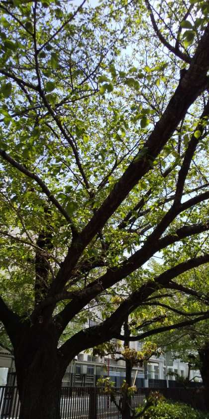また、校庭の木々は、新緑で青々しています。この木は、何か分かるかな?ヒントは、この間まで、花でいっぱいでした。