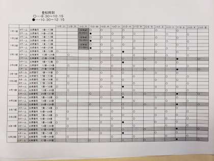 先にお知らせしましたように来週は週1回、18日からの週からは週2回の登校日を設けるように教育委員会から指示がありました。そこで出席番号別にA,B.Cチームに分け、分散して登校するように計画いたしました。学年によって2分割(1,3,5年)、3分割(2,4,6年)がありますのでご写真でご確認ください。