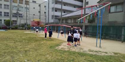 運動場の遊具で遊びました。少しリラックスできたかな?
