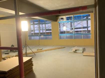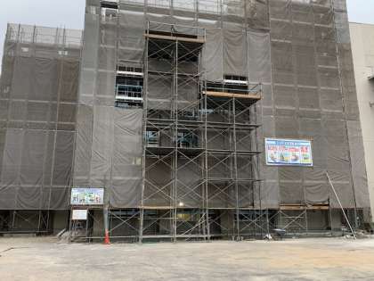 現在、新校舎は4階まで外壁が立ち上がって各部屋の内装に取りかかられています。工事現場の写真を撮らせていただきましたのでご覧ください。