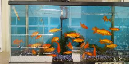 玄関の水槽が熱帯魚に代わったことは、お知らせしましたが、前にいた金魚は、どこへいったのかな?心配してくれている人もいると思います。安心してください。校内にこのように水槽を管理作業員さんが磨いてくださって元気にしています。どこにいるかは、学校たんけんして見つけてください。 ヒント:1階のある教室のくつ箱の上にいます。