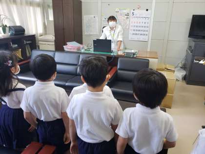 一昨日は、学校たんけんをしました。職員室や校長室の入り方も勉強し、しっかりと「1年〇組です。どうぞよろしくお願いします。」とあいさつすることができました。廊下の歩き方も上手で、担任の先生のお話もよく聞いていました。少し遠いですが、校長室にもお話しに来てください。