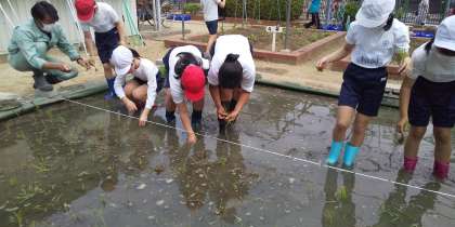今日は、Bチームが田植えをしました。少し曇っているので、涼しい中ですることができました。やはり1回目は、田んぼの中を歩くのに苦労しました。植えるのは、しっかりと根っこから植えていました。田んぼいっぱいに苗が植えることができました。これから育っていくのが楽しみですね。