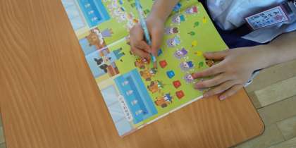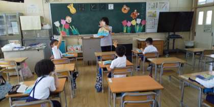 算数は、5までの数の復習をして、同じなかまを〇でくくったり、どちらが多いか線で結んで調べたりしました。みんな集中してがんばりました。