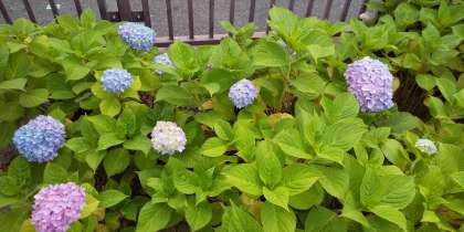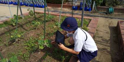 校庭に出るとアジサイが綺麗に咲いています。カタツムリはいるのかな?学習園に行くと4年生が登校日に観察したひょうたんが、どれくらい大きくなったか調べるためにタブレットで写真を撮っていました。