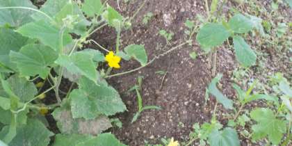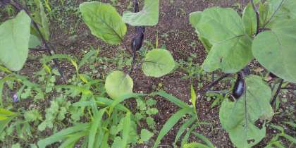 栽培委員会の学習園の植物も梅雨に入って大きく育ってきました。ナスの実もなっています。その隣の植物は、白い花が咲き始めました。それでは、第1問です。この植物は何でしょう?第2問です。黄色い花で、つるがあり、ギザギザの葉っぱですが、ヘチマではありません。この植物は、何でしょう?