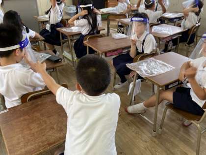 今日から全員揃ったので、学級活動で「学級目標を決めよう」を議題に話し合いました。近くの友だちと小グループで話し合う場面があり、さっそくフェイスシールドを活用しました。どんな学級目標になったのかな?