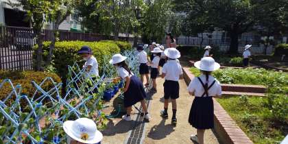 お家で育てていただいたあさがおのつるが伸びて、しっかり育っています。子どもたちも水やりを学校でも頑張っています。花が咲くのは、いつかな?
