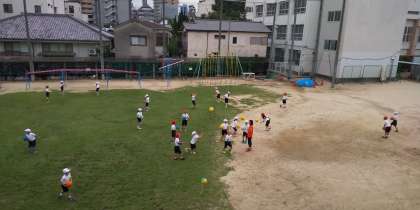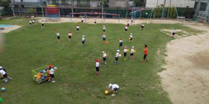 今日は、運動場でボールを使って運動しました。高く投げ上げてキャッチできたかな?投げ上げている間に拍手をしてキャッチしている人もいて、みんなで何回手がたたけるか試してみました。