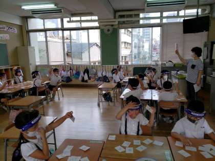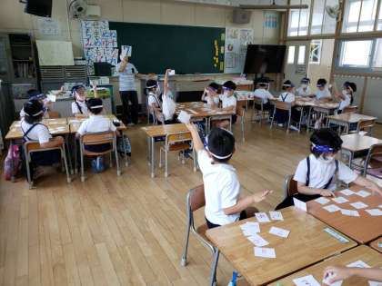 自分たちの作った数字カードを机に置き、10になる数字のカードを取ります。例えば教職員が「3」といったら「7」のカードを取ります。友たちに負けないようにカードに集中。取った時の歓声が教室に響き渡りました。