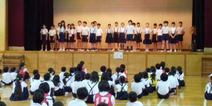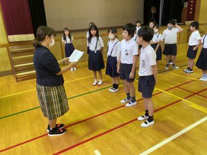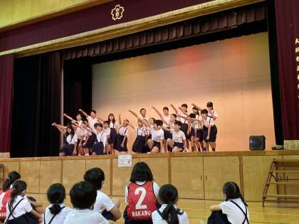 昨日・今日とたてわり班A・Bに分かれて認証式を講堂で行いました。運営委員、学級代表、委員会代表の人がそれぞれどんな学校にしたいか自分の思いをあいうえお作文にしたり、歌にしたりコントにしたりクイズにしたりとそれぞれで工夫し、しっかり話すことができました。一生懸命な姿に自然と拍手が起こりました。みんなで中野小学校をつくっていきましょう。