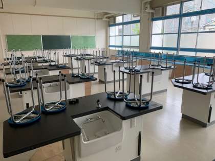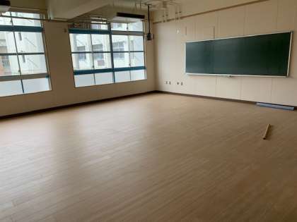 先週末に理科室に実験台(テーブル)と丸椅子が搬入され、理科室らしくなっていきました。(上記左写真)また、普通教室にも黒板が入っていました。外観だけでなく内装もどんどん出来上がっています。完成が楽しみですね。