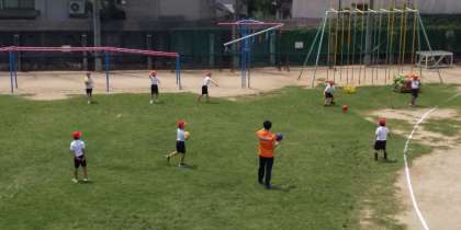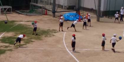 暑い中、元気な声が運動場から聞こえてきました。二人組になってパス練習をしていました。速いボールは受けるのが難しいのでワンバウンドにして受けている子もいました。手をまあるくしてボールが勝手に手の中に入ってくるようにキャッチしましょうね。もちろん水分補給もしっかりしています。