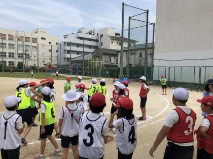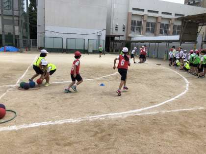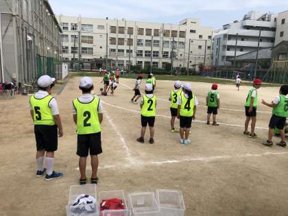 夏の日差しのもとチームに分かれて、4年生5年生が協力してがんばりました。緊張している4年生を、5年生が上手にリードしていました。最後は、4年生対5年生。ガンバレ・ガンバレ。結果は・・・。