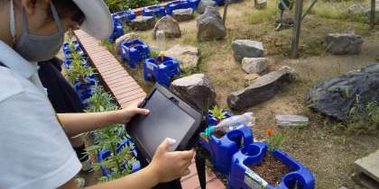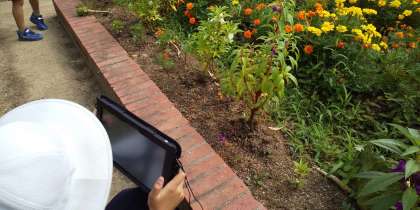 3年生が植木鉢に植え替えた花や学習園の花を観察し、タブレットで写真に撮って記録しています。