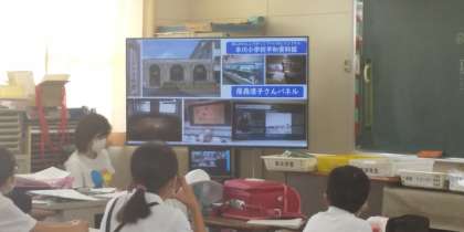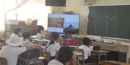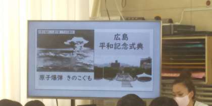 今日は、8月6日広島に原爆が投下された日です。4・5・6年の教室でそれぞれプロジェクターに映されたパワーポイントを見ながら広島市立本川小学校でたった一人生き残った児童の方の手記をもとに図書館補助員の川田さんが読み聞かせをしてくださいました。ちょうど6年生だった方なので6年生はより身近なことに感じ、聞き入っていました。また、5年生は、お話の感想を一人ずつ一生懸命書きました。「わたしにできることは、周りの人に優しくすること」「75年前の日本で起こったことをちゃんと次の世代に伝えたい」など自分の考えがしっかり書けていました。みんなのメッセージは、図書室の平和コーナーに飾ります。そして、昨年の折り鶴とメッセージは、本川小学校の資料館に飾ってもらえるように川田さんが送ってくださいます。