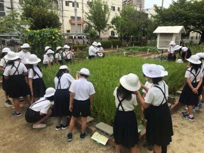 総合学習として稲を育てている5年生たちが、理科の時間に稲を観察しました。