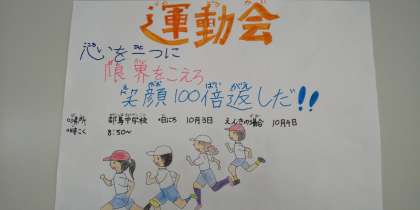 運動会のめあてが「心は一つ 限界をこえろ 笑顔100倍返しだ!!」に決まりました。「心は一つ」には「みんなで協力して」の意味が、「限界をこえろ」には「感染症予防の観点から制限がたくさんある中で、気持ちだけは、制限を超えてみんなとつながりたい」という意味が、「笑顔100倍返しだ」には、もらった笑顔には100倍すてきな笑顔をかえそう」という意味がこめられています。できないことが多い中、できることを工夫してみんなで運動会を成功させたいという気持ちが込められています。各委員会での当日まで、当日の役割分担も決まり、新聞委員会が校内ポスターを早速作って掲示しています。学校に来られた折には、ポスターもぜひ、見てください!