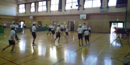 運動場では、ドッジボール、体育館では、バスケットボールと2チームに分かれて活動しました。