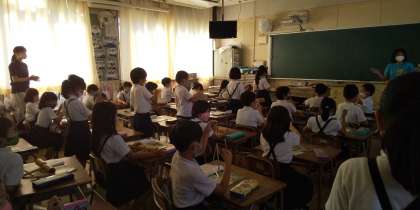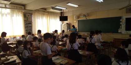 タンバリン、すず、カスタネット、トライアングルを順番に曲に合わせて演奏しました。みんなリズムよく打楽器を演奏することができました。
