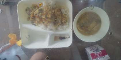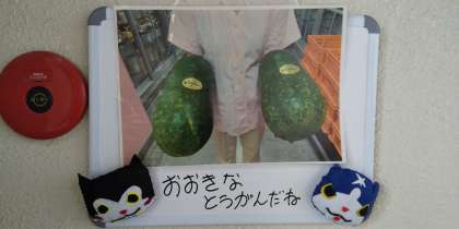 今日の給食は、他人丼、とうがんのみそ汁、金時豆の煮物でした。とうがんのみそ汁に使った大きなとうがんです。