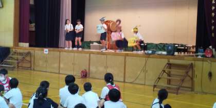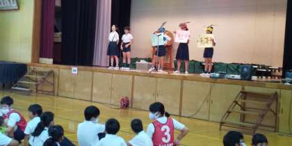 今日は、人気の集会「1・2・3博士」でした。3年1組 吉田先生の好きな食べ物、2年1組 香西先生の好きなスポーツ 4年1組 本村先生の好きな有名人の三問でした。この問題の答えを1・2・3博士がそれぞれ理由を付けて教えてくれます。その答えを聞いて、班のみんなで相談して、どの博士が言ったことが正しいか当てるゲームです。1博士なら1列に並ぶ、2博士なら2列に並ぶ、3博士なら円になるというふうに答えます。ちなみに吉田先生の好きな食べ物は、キムチ。香西先生の好きなスポーツは、テニス、本村先生の好きな有名人は、ヒョンビンでした。1・2・3博士の答えはどれも正解のようにうまく話せていましたよ。