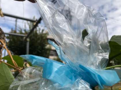 みんなで見つけた雌花のつぼみに袋を被せて、今日の実験は終了です。