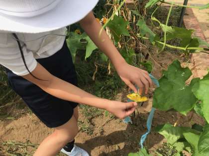 前回の実験でビニル袋を被せていた雌花に、雄花のおしべをつけました。