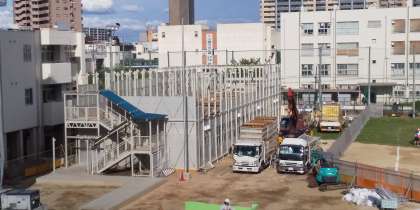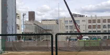 先週から1年半過ごしたプレハブ校舎の解体が始まっています。2階部分がほとんど解体されました。