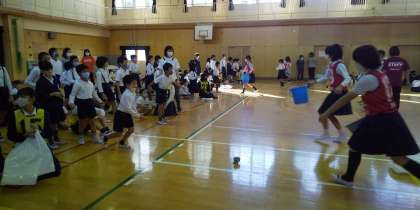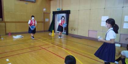 今週の集会は、「ポイポイゲーム」でした。みんなが投げる新聞紙の玉をリーダーがバケツでキャッチするというゲームです。思いを込めてリーダーにポイポイ!みんなの玉をリーダー飛び込んで取ってましたよ