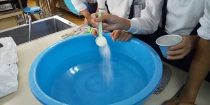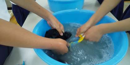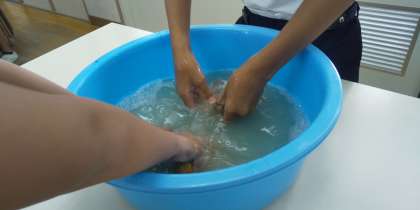 6年生が家庭科で洗濯の実習をしました。靴下についた土汚れを手洗いでしました。洗濯石鹸を水に溶かして靴下を入れて押し洗いやもみ洗いを始めると水が汚れてみんなびっくり。一度水を換えて今度は取れにくいところをつまみ洗いしました。