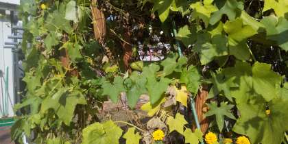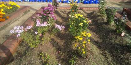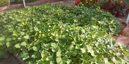 秋になって学習園も変わってきています。へちまは、熟しています。6年生の花壇では、色とりどりの菊が咲いています。2年生の花壇では、サツマイモの葉が元気に青々しています。土の中のおいもは、大きくなっているかな?