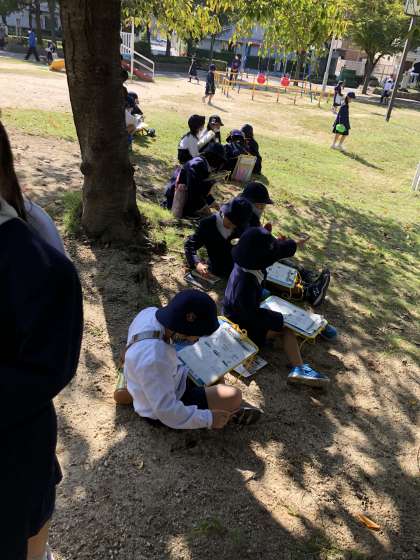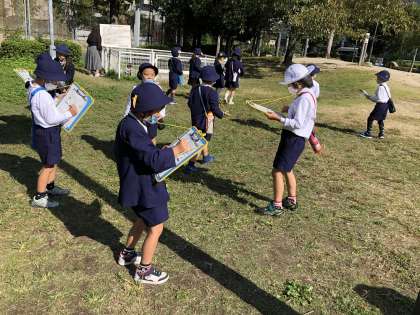 今日は、都島中央公園へ公園たんけんに行きました。すごくいいお天気で、「見つけよう」のチャレンジもすぐに見つけることができました!ドングリや、ショウリョウバッタも見つけました。とっても楽しかったです。