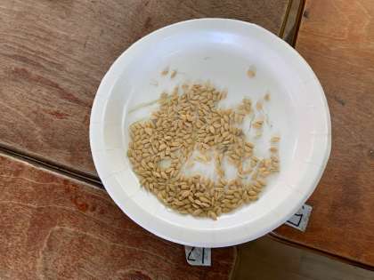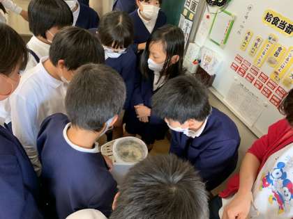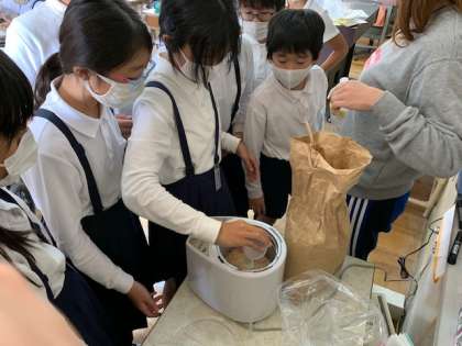 先週稲刈りをした米を精米機を使って精米を行いました。もみも用意していただき、実際に触って手でむいてみる体験も行いました。手でするとむきにくい、固いなどの感想が出ていました。また、精米機にかけると真っ白になっていく様子を見ることができました。「なかの米」を次は調理したいと5年生は意欲的でした。