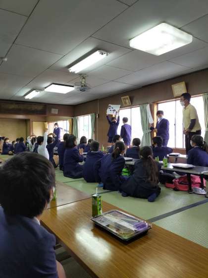 陶芸の森でするはずだった○?クイズを食事会場でしました。先生の好きな食べ物やスポーツなど係の人が用意した問題に手でジェスチャーをして答えました。