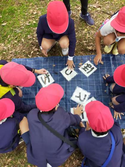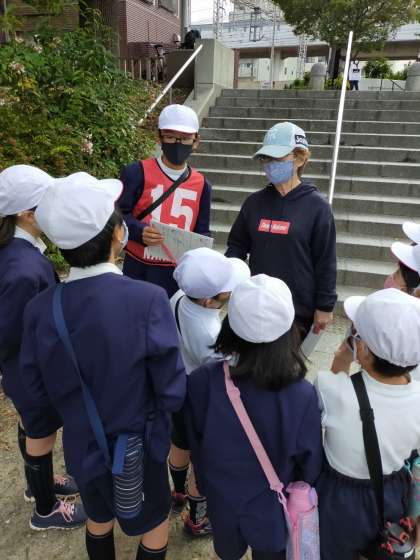 川崎橋下では、テレパシーゲーム、問題は「ドラえもんの道具といえば?」同じ道具を言えた人の数だけ点数になります。全員言えた班は10点です。上手く揃ったかな。歩道橋を渡って、京橋口から大阪城に入りました。ここでは「ほんやく こんにゃく」ばらばらのひらがなのカードを並べ替えてことばにします。みんなで協力して10秒で言えたら10点。みんなで協力して分かったかな?