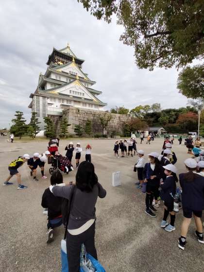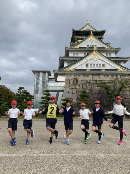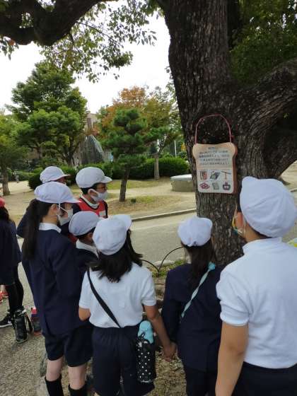 天守閣につきました。ここでは、みんなで決めたポーズで記念撮影です。ここにも木に指令がありました。6つの道具を班で分担して覚えていました。