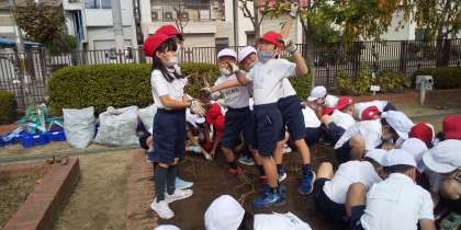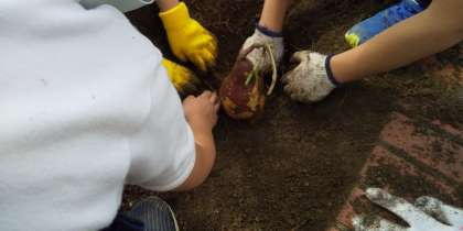 1組でも、深く掘ってもなかなか掘り起こせないいもがあり、協力しています。たくさんいもが掘れて笑顔いっぱいです。