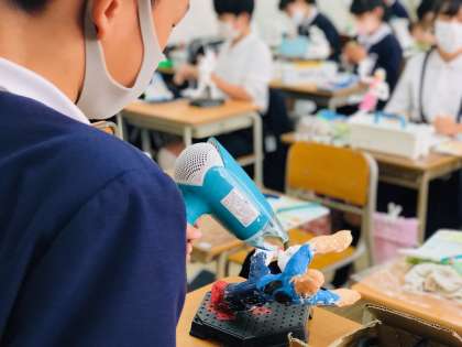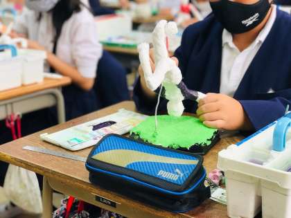 心材に紙粘土をつけて形を作ったものに、いよいよ色を塗り、ニスを塗っていきます。