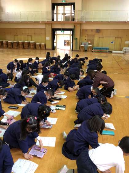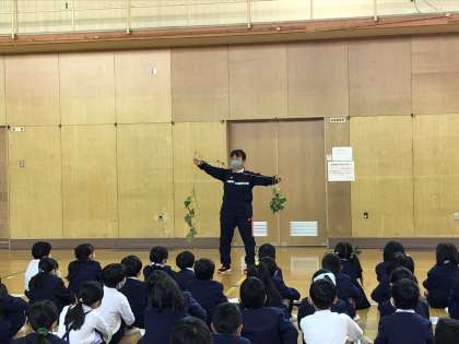 芋ほりの前に、講堂で「さつまいもであそぼう」と葉は腐らせて腐葉土に茎はきんぴらにして食べる、つるは、なわとびやリース魚釣りゲームなどにして遊ぶ、おいもは、スイートポテトや大学芋や焼いもにして食べたり、いものはんこを作ったりとまるごと生かせる学習をしました。