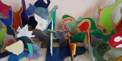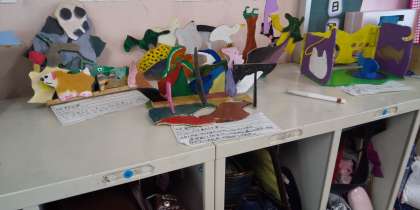 1枚の板を自由な形に切ってそこから組み立てて作っています。電動糸のこを使って切りました。