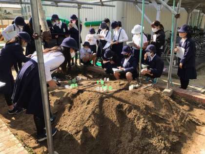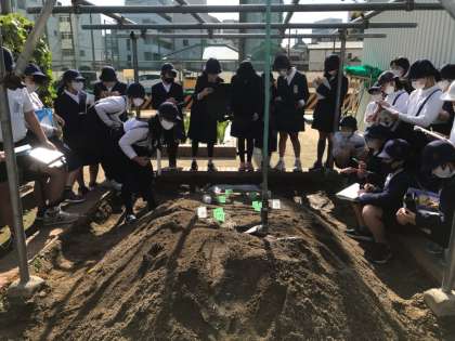 曲がった溝に沿って水が流れると、カーブの外側の土は削られ、内側に土が積もっていく様子を、5年生達はしっかりと観察していました。